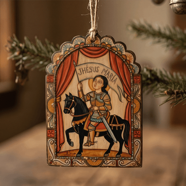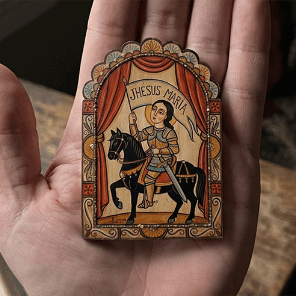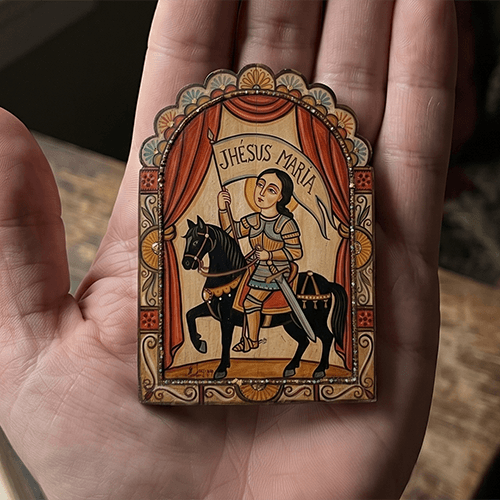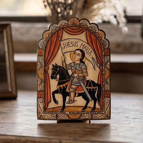 St. Joan of Arc supports soldiers, military personnel, and anyone facing unjust trials or needing courage in their convictions. A Retablo of St. Joan would be a profoundly meaningful gift for someone serving their country, offering comfort and strength in challenging times. It also serves as a powerful reminder for anyone standing firm in their beliefs despite ridicule or opposition. This beautiful piece honors her unwavering spirit and offers a beacon of hope and divine protection.