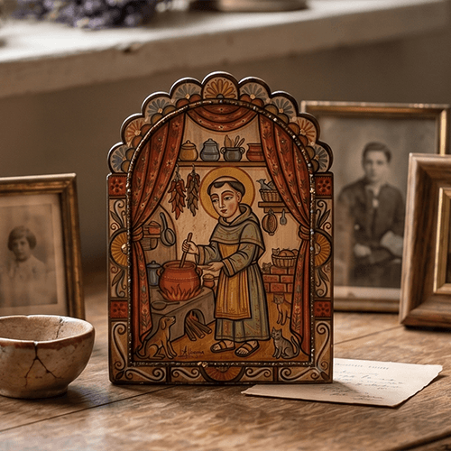 Saint Pasqual (San Pasqual) supports cooks, chefs, bakers, and all who nourish others through food, as well as altar servers and shepherds. A Retablo of Saint Pasqual would be a truly meaningful gift for a chef or baker, offering comfort and inspiration in their daily work. It honors their dedication to feeding others, reminding them of the spiritual grace found in humble service, and bringing a blessing to their kitchen and creations.